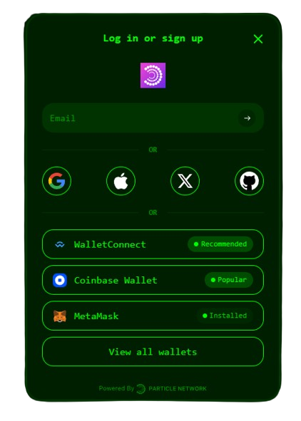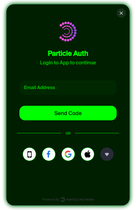 As an alternative to Particle Connect, Particle Auth (@particle-network/authkit) offers a dedicated modal containing exclusively social logins. The most common way to customize this interface is through programmatic style definitions, which can be applied during SDK initialization through the AuthCoreContextProvider component, as will be demonstrated below.